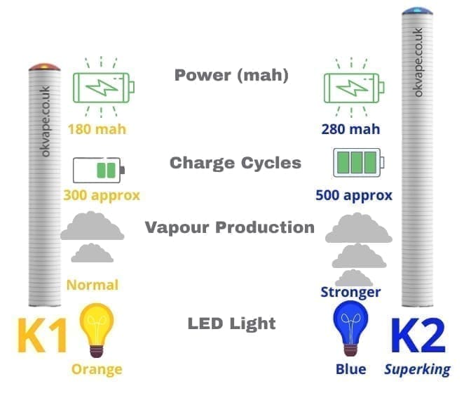 - 1 x eCigarette Battery (Cross Compatible OK Vape Rechargeable Battery) (K- Series by Nemo KN1 180mah standard or K-Series by Nemo KN2 280mah SuperKing.
