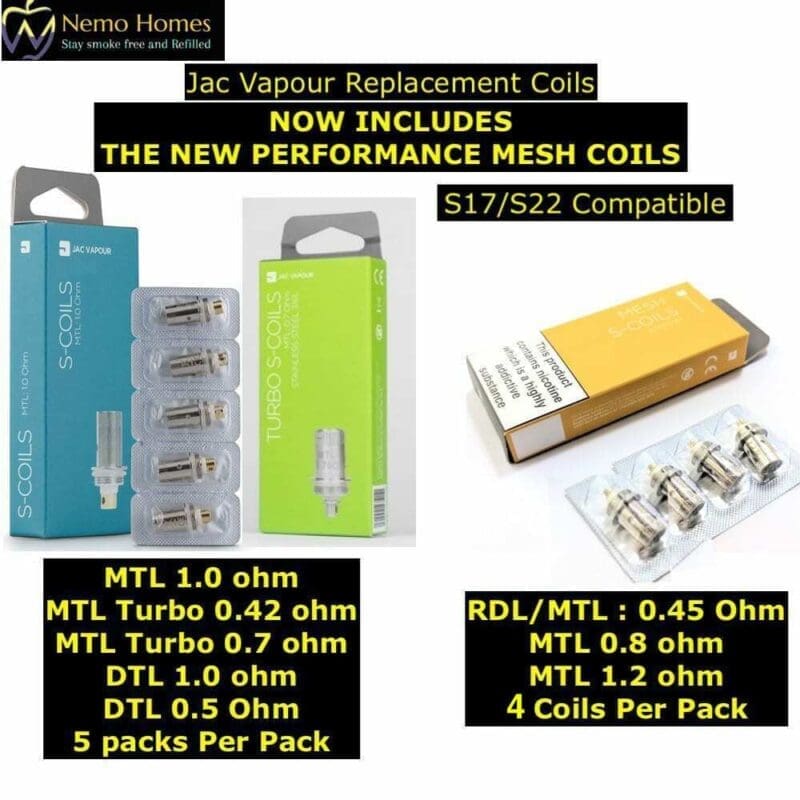 - Pack of 5 replacement JAC Vapour S-Coil DL – 0.5Ohm coils.