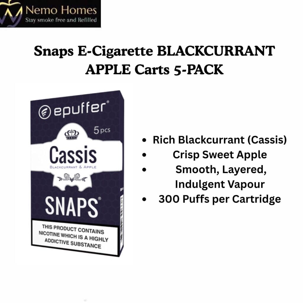 Enjoy the smooth, satisfying harmony of SNAPS® Cassis & Apple Cartomizers—a unique, flavourful choice for adult vapers seeking a refined sweet option.