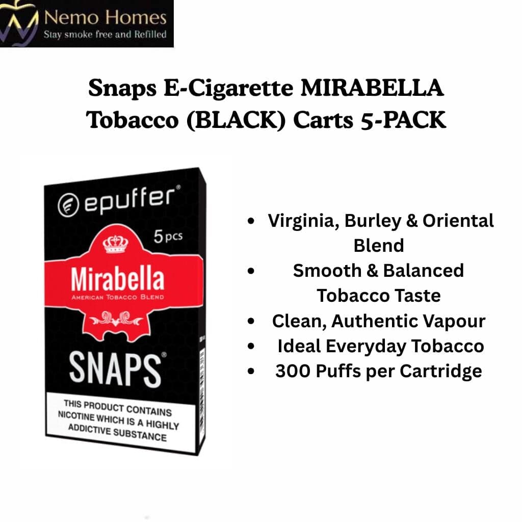 Experience a refined, balanced tobacco flavour with ePuffer SNAPS® Mirabella Tobacco Cartomizers, designed for the SNAPS® cigalike electronic cigarette system. This smooth blend combines rich Virginia tobacco, the earthy depth of Burley, and aromatic Oriental notes, producing a clean, authentic vapour that makes Mirabella a popular choice for adult smokers transitioning to vaping.